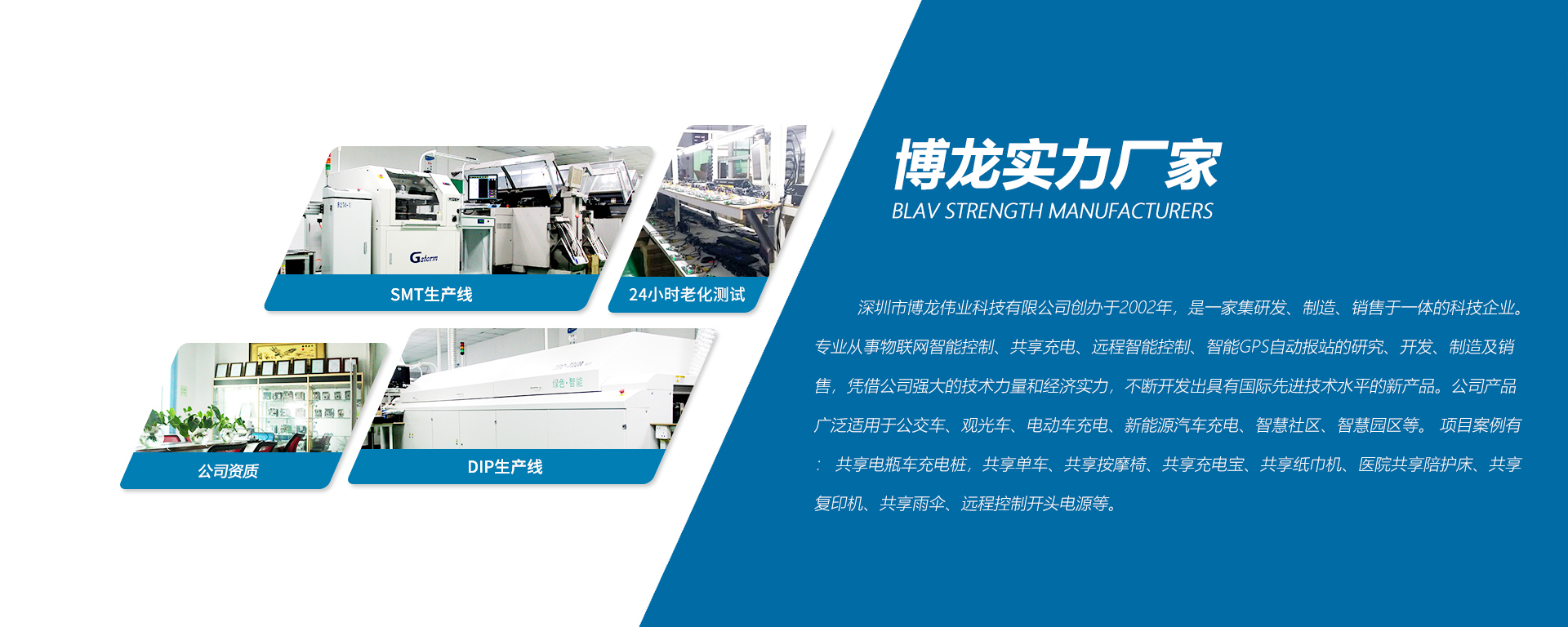 深圳市博龍偉業(yè)科技有限公司創(chuàng)辦于2002年,是一家集研發(fā)、制造、銷售于一體的科技企業(yè)。專業(yè)從事物聯(lián)網(wǎng)智能控制、共享充電、遠(yuǎn)程智能控制、智能GPS自動報站的研究、開發(fā)、制造及銷售,憑借公司強(qiáng)大的技術(shù)力量和經(jīng)濟(jì)實(shí)力,不斷開發(fā)出具有國際先進(jìn)技術(shù)水平的新產(chǎn)品。公司產(chǎn)品廣泛適用于公交車、觀光車、電動車充電、新能源汽車充電、智慧社區(qū)、智慧園區(qū)等。 項(xiàng)目案例有: 共享電瓶車充電樁,共享單車、共享按摩椅、共享充電寶、共享紙巾機(jī)、醫(yī)院共享陪護(hù)床、共享復(fù)印 機(jī)、共享雨傘、遠(yuǎn)程控制開頭電源等。